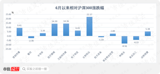 对应板块涨跌幅情况,6月以来生物制品板块相对沪深300的涨幅最大,累计超额收益为22.17%。换手率最大的营销传播板块,超额收益为9.41%。换手率靠前的种植业,负收益最大,为-8.56%。