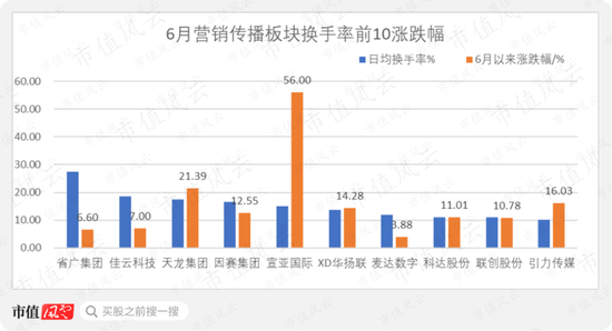 剔除今年上市的新股,营销传播板块6月换手率较前10的个股中宣亚国际涨幅最大,日均换手率15.03%。宣亚国际凭借子公司与字节跳动合作概念,引起多方关注,股价累计涨幅56%。