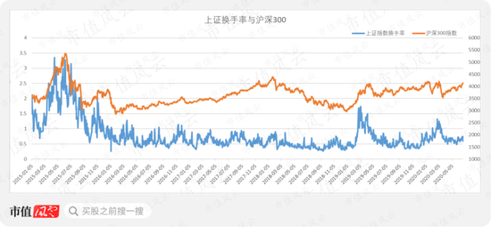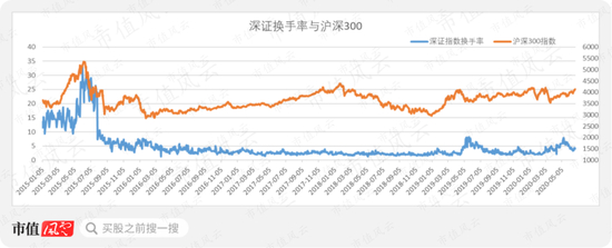 沪深300指数在2015年6月8日达到峰值5353点,深证换手率高达26.5%,上证换手率高达3.3%,皆达到历史以来的最大值。后续大盘一路下跌,至今还未恢复。