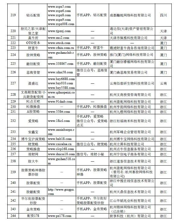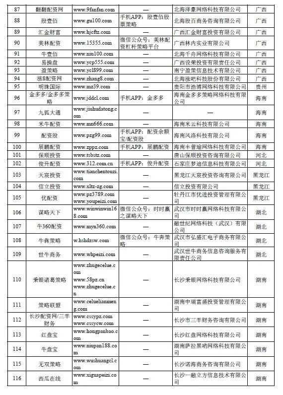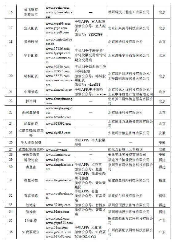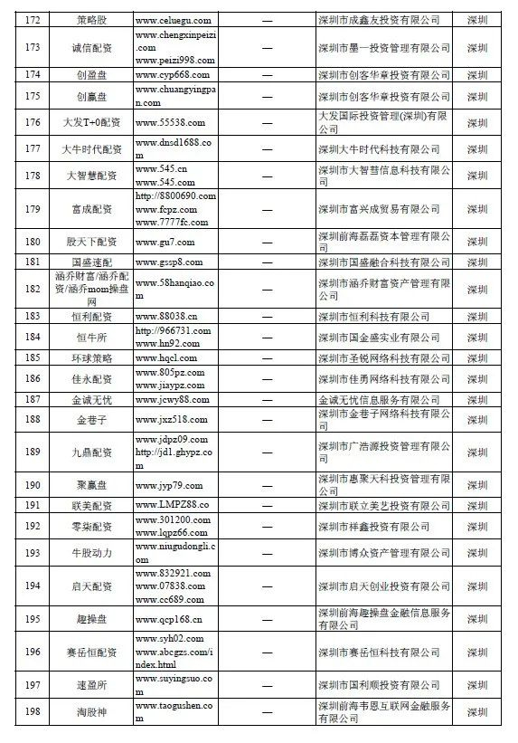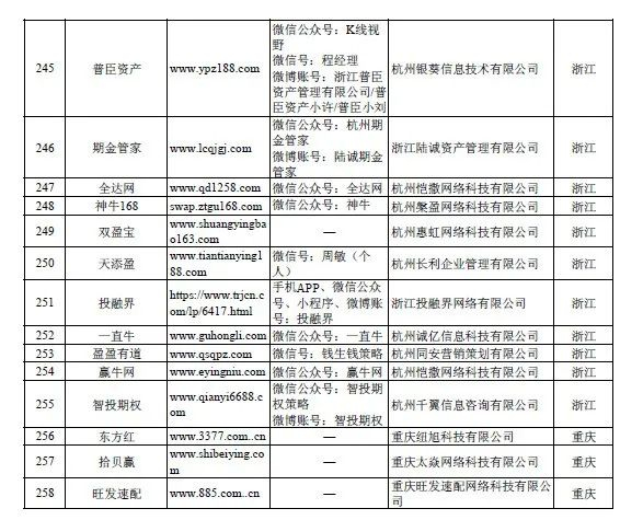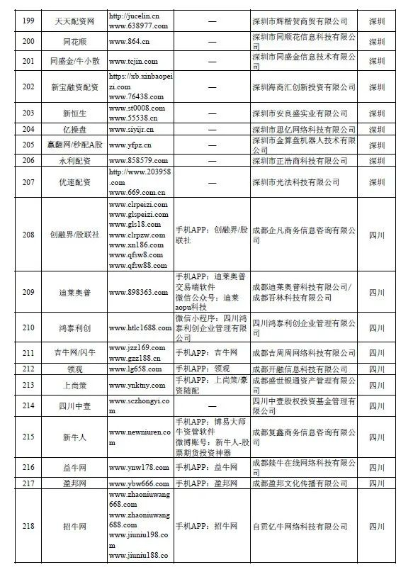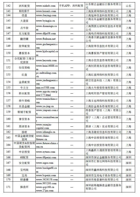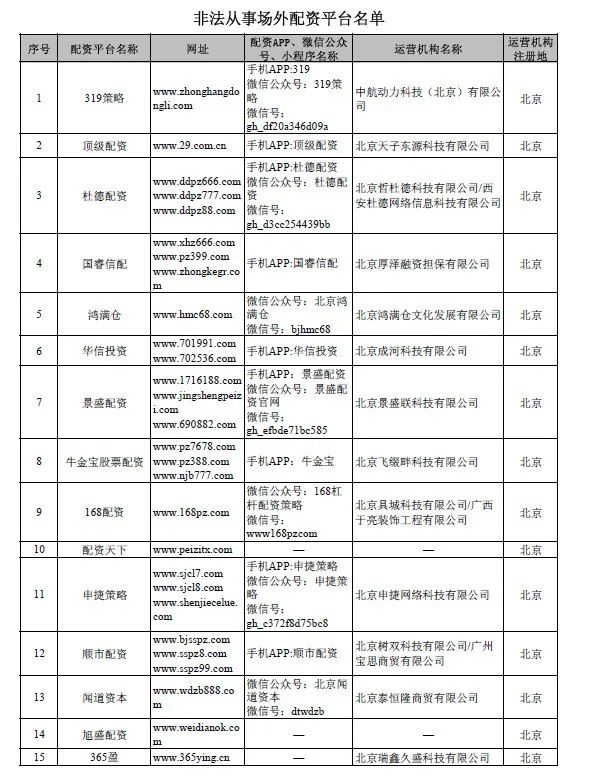 证监会表示,目前,一些不法机构或个人创建场外配资网站、手机APP、微信公众号等平台,宣称提供最高十余倍的炒股资金,以“您炒股、我出钱”“杠杆炒股、盈利高”“实盘交易、门槛低”“资金安全、提现快”等为噱头,诱导投资者参与场外配资活动。近日,各地证监局曝光了一批场外配资平台,经汇总整理,现将258家非法从事场外配资的平台及其运营机构名单予以集中曝光。