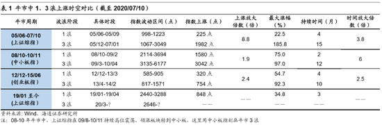 市场趋势向上,速率将回归正常。历史上看,牛市3浪期间市场整体趋势向上,3浪初期指数月度涨幅通常会突然放大,随后涨幅速率会回归正常。05/06-07/10牛市的3浪为06/01-07/03,3浪初期出现了月度涨幅超过10%,06年4月上证综指上涨10.9%、沪深300上涨10.5%,5月分别为14.0%、16.5%,之后指数上涨速率回归正常水平,3浪期间上证综指、沪深300月度平均涨幅为7.1%、7.7%,整个牛市期间月度涨幅均值分别为6.4%、7.1%。08/10-10/11牛市的3浪以中小板指刻画为09/02-10/04,3浪初期中小板指月度涨幅曾高达13.9%(09/03),3浪期间中小板指月度平均涨幅为4.4%,整个牛市期间月度涨幅均值为3.9%。12/12-15/06牛市的3浪以创业板指刻画为13/4-14/2,3浪初期创业板指月度涨幅曾高达20.7%(13/05),3浪期间创业板指月度平均涨幅为5.4%,整个牛市期间月度涨幅均值为5.7%。7月1日至今(截至2020/07/10,下同)上证综指涨幅已达到13.1%、沪深300上涨14.1%,牛市3浪已经徐徐展开,借鉴历史经验,指数不可能保持这个上涨速率,最终会回归正常水平。我们再展望的更远一点,未来牛市3浪上涨结束进入牛市4浪回调的因素可能有哪些,关注两类潜在风险点:第一,通胀上升导致货币政策转向收紧,从历史经验上看,CPI和PPI达到3%以上可能会触发货币政策收紧;第二,关注事件性因素的可能冲击,最为重要的是中美关系走向和疫情变化趋势,尤其是今年11月美国大选后中美关系的演变,当前国内疫情虽然已基本得到控制,但年底北半球气候转冷,疫情会否出现二次高峰值得关注。