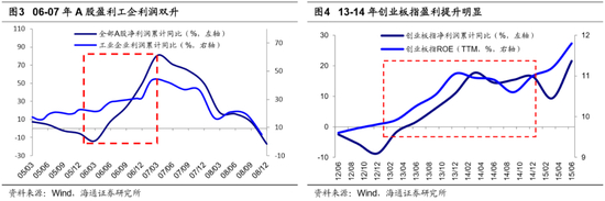 牛市3浪上涨背景是基本面回升,戴维斯双击。牛市是一个感性的认识和模糊的概念,金融学并没有严格的定义,我们认为,牛市的核心是赚钱效应强,表象特征是指数涨、大部分股票上涨、场外资金进场。我们在前期报告《牛市有三个阶段-20190303》中提出牛市可以分为孕育期、爆发期、泡沫期,它们的特征差异十分明显。孕育期(对应波浪理论的1浪上涨+2浪回调)主要表现为盈利回落、估值修复。这一阶段宏观基本面仍在下行,企业盈利增速回落找底中,但宏观政策已偏暖,流动性好转,估值修复推动市场上涨。市场进二退一,回吐较大,为牛市爆发做准备。爆发期(对应波浪理论的3浪上涨+4浪回调),基本面出现拐点,企业盈利触底回升,盈利和估值均上行,形成戴维斯双击,牛市全面爆发,此阶段市场涨幅最大,所以牛市3浪通常称为主升浪。疯狂期(对应波浪理论的5浪冲顶),企业盈利增速已趋于平缓,失去爆发期的加速度,但以散户为代表的增量资金仍在加速进场,推动市盈率走向市梦率,构筑市场泡沫,形成最后一冲。A股最近三轮牛市(05/06-07/10、08/10-10/11、12/12-15/06),均可以划分以上几个阶段,详见前期报告。进入牛市3浪都是源于基本面数据回升,如05-07年牛市,06/1进入牛市3浪上涨,这一时期基本面企稳回升,工业增加值累计同比从06/01的12.6%上升至2月的16.2%,随后升至07/03的18.3%,工业企业利润累计同比从06年2、3月21.8%、21.3%升至4月22.1%,随后升至07/02的43.8%,全部A股归母净利润同比增速06Q1见底于-14.0%,06Q2升至7.4%,07Q1升至80.7%。如12/12-15/06的创业板指代表的牛市,13/4创业板进入牛市3浪上涨,创业板指净利润同比增速从12Q4的-9.4%反转升至13Q2的1.6%,随后升至14Q4的16.5%。