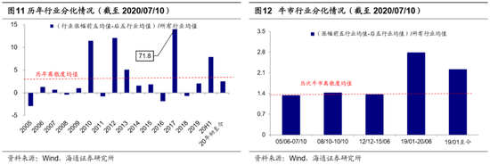 7月以来(截至2020/07/10,下同)低估行业的上涨源于前期分化严重。我们在前期报告《对比历史,看行业分化》中从自然年度和牛熊市两个角度分析了历史与当下的行业分化,从年度看,我们以每年(行业涨幅前五均值-后五行业均值)/所有行业涨跌幅均值作为离散度指标,2020年上半年(截至20200630)离散度为7.9,高于2005-2019年均值2.9,仅半年行业分化程度排名已达历史第四。从牛熊市看,我们以A股最近3轮完整牛市为观察区间,发现05/6-07/10牛市行业离散度为1.33、08/10-10/10为1.49、12/12-15/6为1.36。19年1月开始本轮牛市,截至20年上半年行业间离散度2.83,高于此前三轮牛市。无论是从自然年度视角还是牛熊视角,前期行业分化已明显超越历史。7月以来有色/地产/采掘行业涨幅达18%/16.4%/14%、上证综指涨幅为13.1%,这一阶段市场表现本质是均值回归的再平衡,只是牛市的一种扩散、轮涨。我们认为市场风格不会出现180度转弯,19年7月以来风格钟摆向成长将持续两年左右,目前仍在这一过程中。7月以来行业离散度均值回归也证明这一判断:年度视角看行业离散度年度均值为2.9,今年上半年为7.9,经过7月初以来行业轮涨,当前已回归至2.5;牛熊视角看过去三轮牛市期间行业离散度均值为1.4,19/01-20/06为2.83,19/01至今(截至2020/07/10)为2.21,从这一角度看本轮牛市行业离散度依然偏高,未来或仍将以行业轮涨的的方式下降。