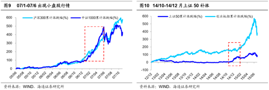 回顾历史,牛市主线与轮涨并不矛盾。历史经验表明,每轮牛市中均会出现对应的主导产业,详见《牛市第二阶段什么行业最强?20190730》。牛市孕育期市场进二退一,回吐较大,行业以轮涨普涨为主,整体是中枢抬升的震荡。而牛市爆发期进入盈利驱动阶段,行业间分化也是以盈利为基准,盈利上升陡峭行业往往涨幅居前,进而形成主导产业,主导产业具有业绩和估值提升明显的特征。结合基金持仓市值占比,我们发现基金在行业配置上更加青睐主导行业,助推主导行业在牛市爆发期即3浪上涨阶段表现更强。例如,05-07年受益于加入WTO和房地产新政,城镇化和工业化加速,05/06-07/10牛市3浪阶段主导产业是以固定资产投资为主的地产产业链;12/12-15/06牛市3浪阶段主导板块是以创业板为代表的科技股,主导产业链是计算机、传媒等TMT行业。根据历史经验,牛市期间会出现主导产业,盈利是其决定变量,但在主线上涨过程中,也会出现其他行业的阶段性轮涨行情,牛市中主线与行业轮涨并不矛盾,我们在《对比历史,看行业分化-20200628》中分析过。例如05-07年的牛市虽然以地产银行为代表的大盘蓝筹股占主导,但在07年1-6月也出现了一轮小盘股行情,在此期间以中证1000为代表的小盘股区间涨幅最大达到113%,同期沪深300区间涨幅最大为84%;12/12-15/6牛市以TMT为代表的成长股为主导行情,但在14年10-12月也出现了金融地产为代表的价值股修复行情,在此期间上证50涨幅59.4%,同期创业板指跌幅-4.5%。由此可见,牛市在主线上涨过程中也要注意其他行业轮涨。