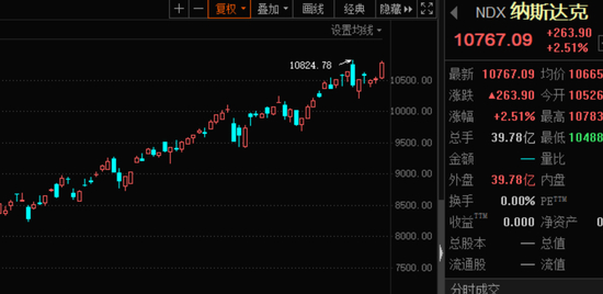 美股周一低开高走全线收涨,道指抹去盘中167点跌幅,收盘微涨0.03%,截至收盘,道指涨0.03%;纳指涨超260点大涨2.51%,再创收盘新高;标普500指数涨0.84%。