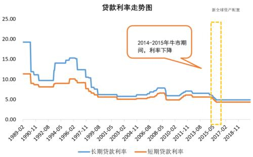 不难看出,整体大趋势在不断走低,这与国际环境是一致的。仔细观察2014至2015年的牛市期间,有很明显的利率下降趋势。回顾当年的政策,2014年4月,6月定向降准;14年年底,再次降息;同年央行推出MLF/PSL等工具,进一步支持货币宽松。