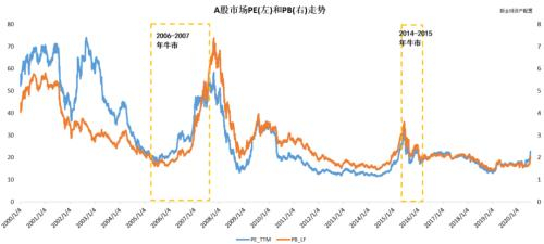 万德全A指数截至2020年7月15日的PE(TTM)和PB(LF)的估值分别为22.176和1.995。从2000年至今的全区间来看,似乎如今A股的估值并不算高,也算便宜。上图中黄线方框表明了A股历史上两次牛市的估值变化情况。