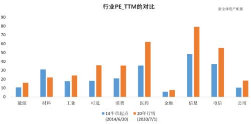 我们简单地按照中证一级行业,将全A股市场划分成10个行业,同样比较14年牛市起点和今年的行情爆发点,这两天各个行业的PE情况,如下图所示: