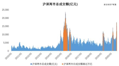 7月以来,沪深两市日成交额再次屡破万亿大关,这个指标也被很多投资者视为市场行情冷热的判断依据之一。下图统计了从2010年至今的日成交总额,不难发现,14至15年的牛市,直到14年年底和15年杠杆疯狂时期,才能够连续达到万亿大关。
