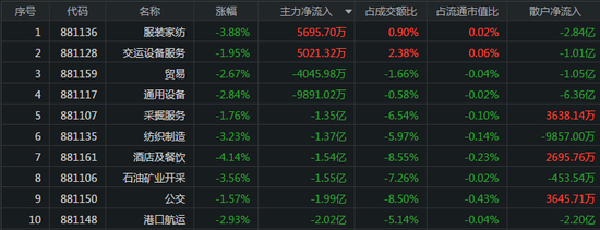 主力资金主要流入服装家纺、交运设备服务两个行业,流入金额分别为5695.70万元、5021.32万元,其中散户净流入金额为-2.84亿元、-1.01亿元。两个板块的涨幅分别为-3.88%、-1.95%。