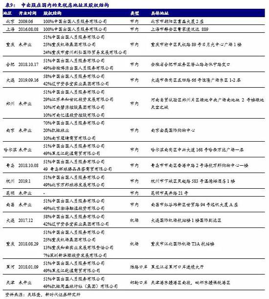 中出服2010 年整体并入中国医药集团有限公司。截至目前,公司在中国境内经营16家入境市内免税店,其中,除北京、上海市内店100%持股外,其他免税店都是与其他企业合资成立,中出服控股51%。