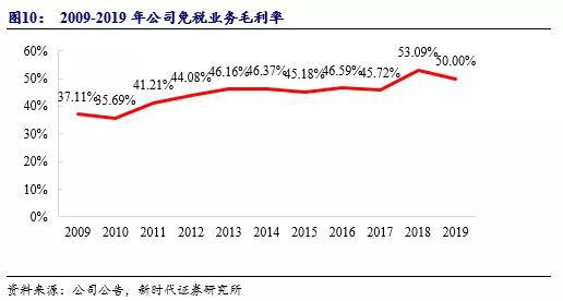 公司毛利率稳步提升至50%以上高位。2015-2019年公司免税业务毛利率分别为45.18%、46.59%、45.72%、53.09%、50%。目前,公司离岛免税主要销售化妆品,毛利率50%左右,随着离岛免税放宽箱包、首饰、手表等高档精品等60%以上毛利率的产品销售,未来公司综合毛利率有望继续提升。