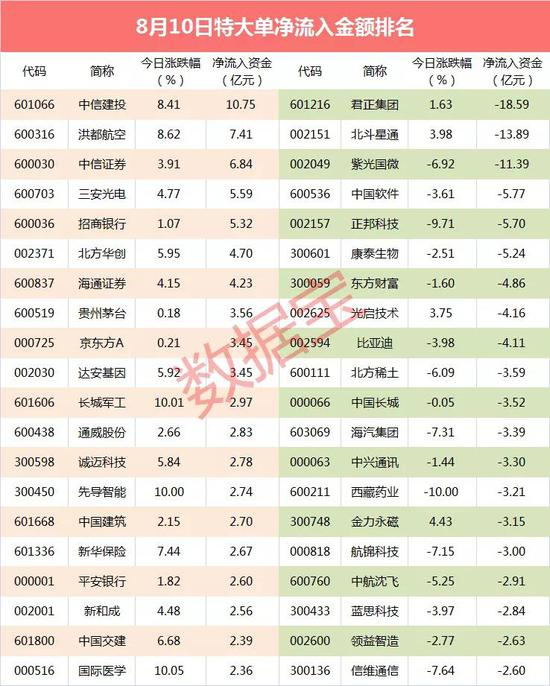 紧随其后是洪都航空,特大单资金净流入为7.41亿元。中信证券大单资金净流入排名第三,为6.84元。