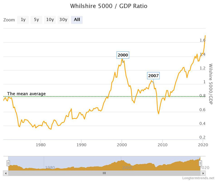 截至7月29日,Wilshire 5000总市场指数估值约为33万亿美元,而美国第二季度GDP预估为19.4万亿美元。由此计算,”巴菲特指标”目前约为170%,创历史新高。