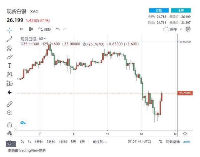 不过,贵金属价格很快出现逆转,当日下午,伦敦现货黄金走高一举收复1900美元关口,最高报1949美元/盎司;现货白银最高报26.28美元/盎司。