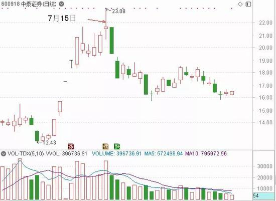此外中信证券上海溧阳路还在中泰证券上面亏过钱,7月15日,其大手笔买入中泰证券39019万元,而中泰证券作为次新券商股,在新股开板后调整了一段时间,遇到了市场传出券商混业经营的消息,而使得券商股成为投资者心中的香饽饽,作为次新股的中泰证券自然少不了一番炒作,公司股价从7月2日至7月8日,期间涨幅60.54%,之后公司股价横盘四个交易日,没曾想到在7月15日,其大手笔买入中泰证券39019万元,随着溧阳路大手笔扫货,中泰证券股价也见顶了,当日盘中虽然有涨停,之后被砸开,收出了高位十字星。次日,也就是7月16日,公司股价跌停,7月18日再度跌停。