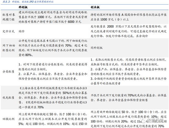 与此同时,《上海证券交易所科创板股票发行与承销实施办法》规定不低于网下发行股票数量的50%优先向公募基金、社保基金、养老金、企业年金基金和保险资金配售,《促进科创板初期企业平稳发行行业倡导建议》进一步提升至70%,而创业板则直接在《发行与承销业务细则》中明确,网下发行数量中的不低于70%优先向公募基金、社保基金、养老金、企业年金基金和保险资金配售。