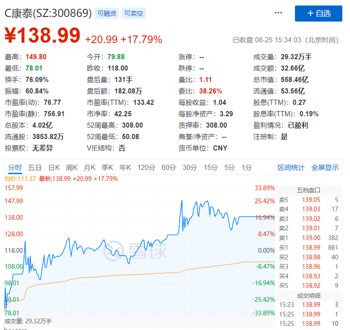而昨日大涨10倍的C康泰,上午走势出人意料,低开32%后迅速翻红,午后最高涨近27%,全天振幅超60%。