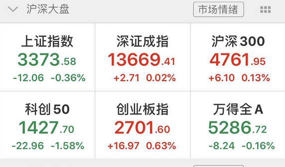截至收盘,沪指跌0.36%,报收3373点;深成指涨0.02%,报收13669点;创业板指涨0.63%,报收2701点。资金面上,两市成交额约9400亿元,北向资金净买入约17亿元。