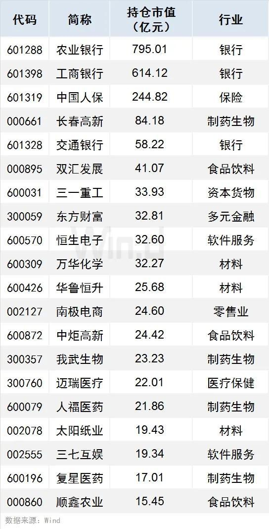 1、有56只个股持仓市值超10亿元(含10亿),农业银行、工商银行、中国人保持仓市值居前,分别达795.09亿元、614.12亿元、244.82亿元。