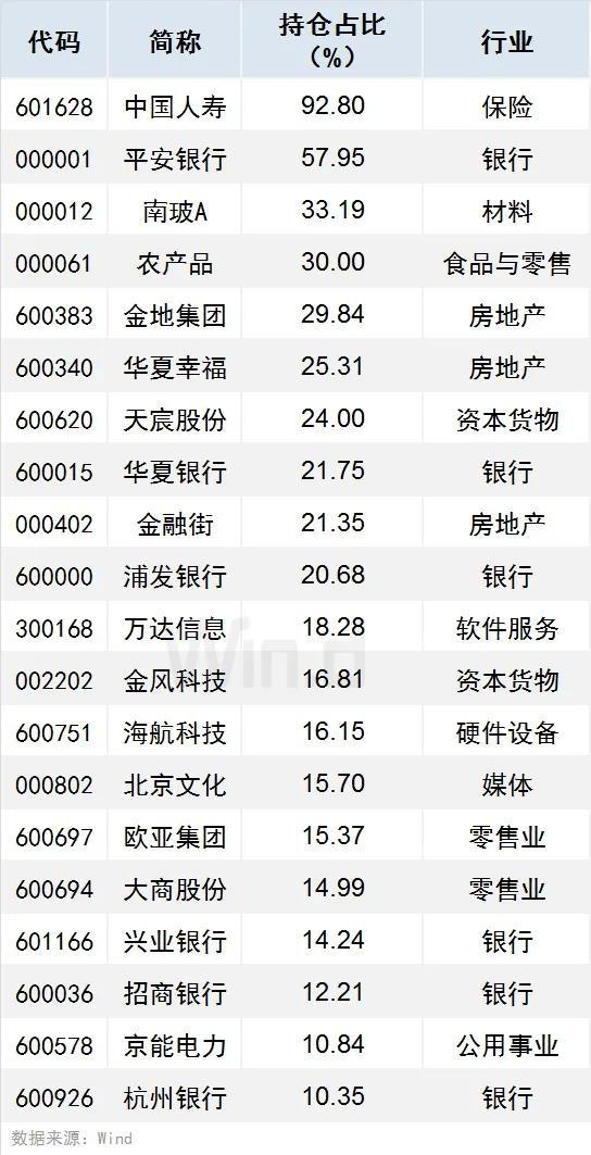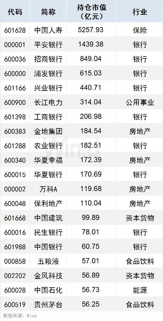 1、有56只个股持仓市值超10亿元(含10亿),中国人寿、平安银行、招商银行持仓市值居前,分别达5257.93亿元、1439.38亿元、849.04亿元。
