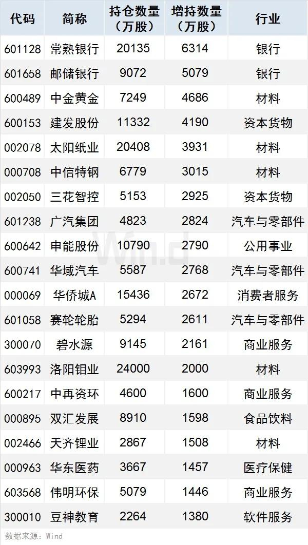 1、增持个股方面,按增持数量计算,社保基金二季度重仓个股共有26只获增持数量在千万股以上(含1000万股),其中常熟银行、邮储银行、中金黄金增持数量居前,分别达6314.05万股、5079.32万股、4685.65万股。
