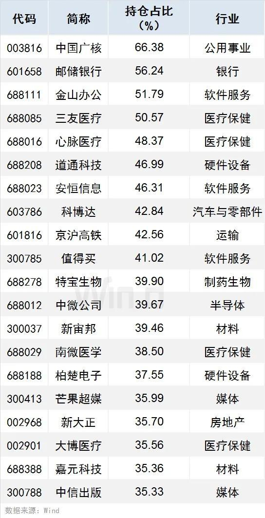 2、有718只个股持仓占比(占流通股比例,下同)超过5%(含5%),中国广核、邮储银行、金山办公持仓占比居前,分别达66.38%、56.24%、51.79%。