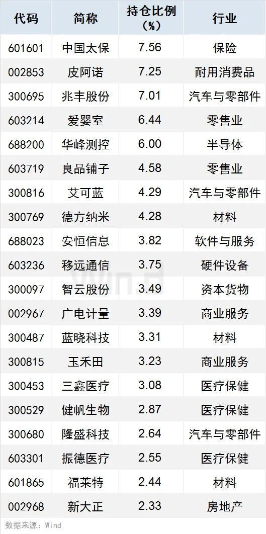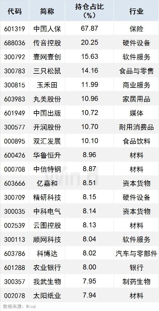 2、有59只个股持仓占比超过5%(含5%),中国人保、传音控股、壹网壹创持仓占比居前,分别达67.87%、20.25%、15.63%。