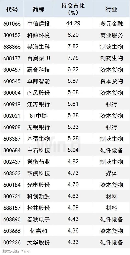 2、有40只个股持仓占比超过3%(含3%),中信建投、科融环境、昊海生科持仓占比居前,分别达44.29%、8.20%、7.82%。