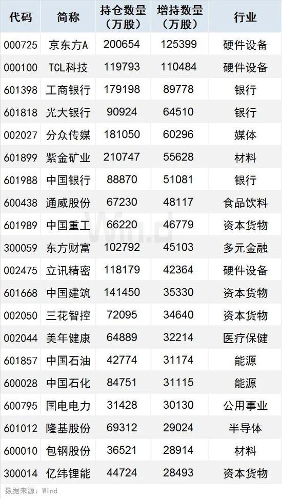 1、增持个股方面,按增持数量计算,基金二季度重仓个股共有124只获增持数量在亿股以上(含1亿股),其中京东方A、TCL科技、工商银行增持数量居前,分别达12.54亿股、11.05亿股、8.98亿股。