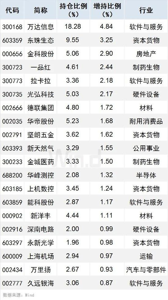 按增持比例计算,险资二季度重仓个股共有9只获增持比例超过5%(含5%),其中万达信息、东珠生态、华致酒行增持比例居前,分别达18.28%、9.55%、8.17%。