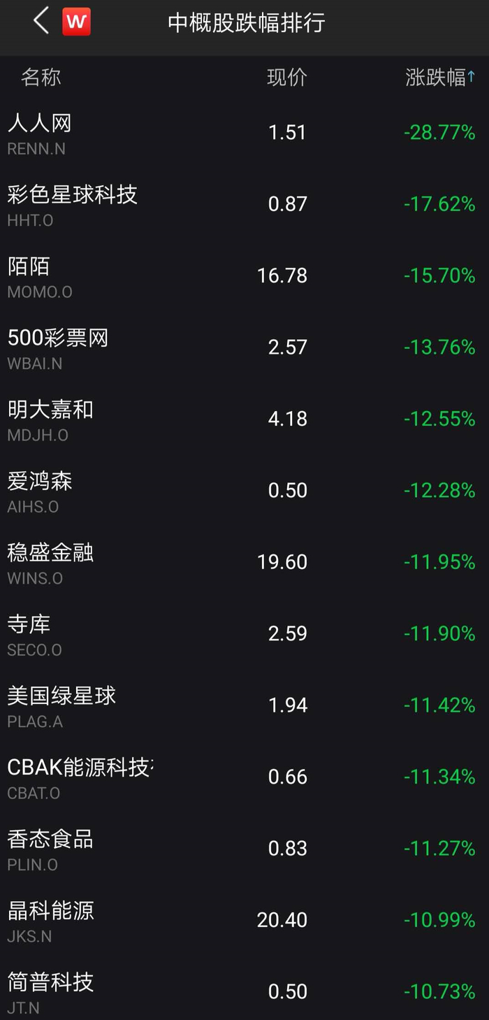周四热门中概股多数收跌,阿里巴巴跌4.62%,京东跌5.01%,百度跌2.29%;人人网跌28.77%,陌陌跌15.7%,500彩票网跌13.76%,斗鱼跌9.27%,虎牙直播跌9.06%,哔哩哔哩跌7.1%,拼多多跌5.02%,蔚来汽车跌6.01%;国双涨17.76%,唯品会涨4.55%。