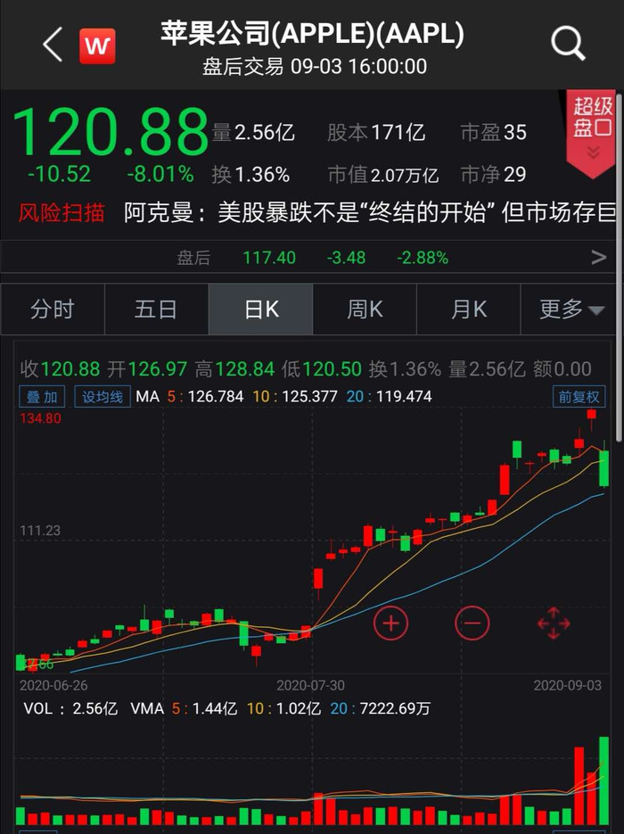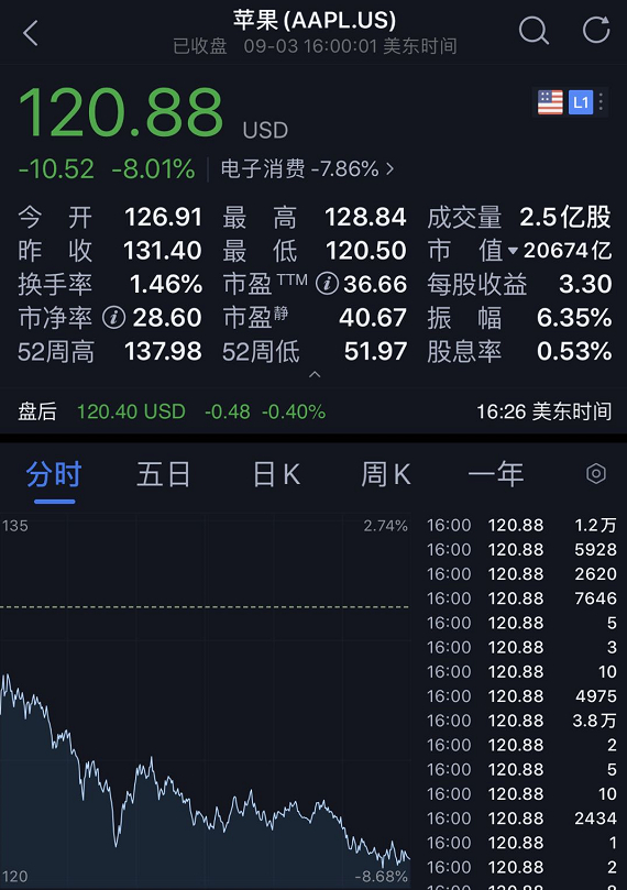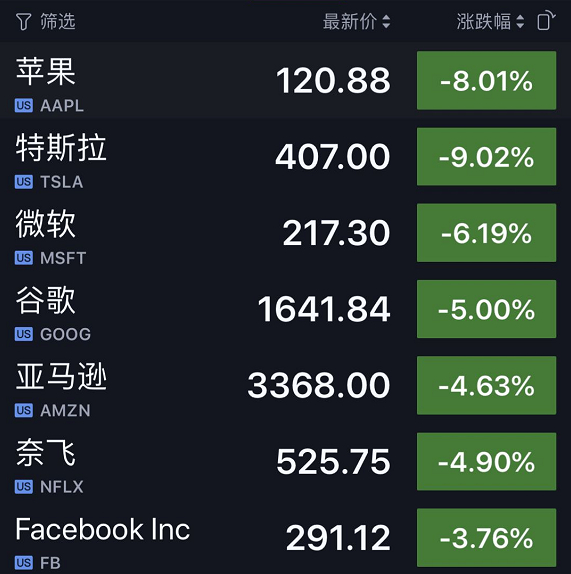 其中,科技巨头苹果股价当天下挫7.93%,特斯拉跌9%,这两家公司近日蒸发的市值就顶一个茅台的A股市值了。亚马逊、网飞和脸书均下挫超过3.7%,标普500指数科技板块下跌超过5%,创下了3月以来最大单日跌幅。
