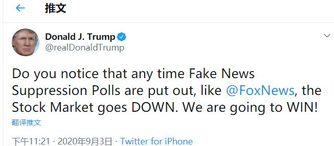 美国总统特朗普(Donald Trump)对此在社交媒体上评论称:“你们有没有注意到,任何时候当被虚假新闻——比如福克斯新闻——压制的民调结果出现时,股市都会下跌。我们会赢的!”