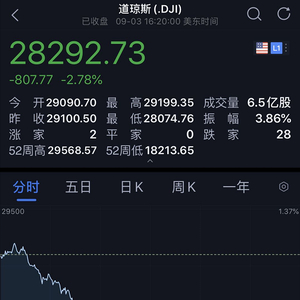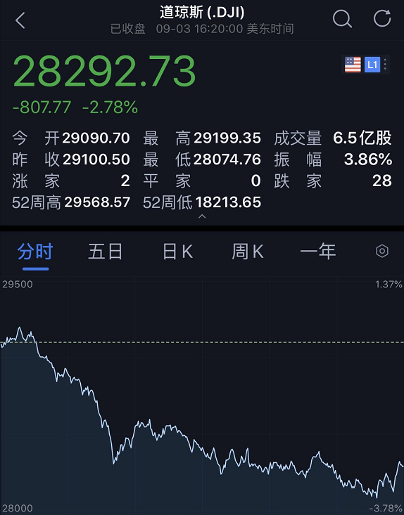 受到科技股普遍回调影响,美国三大股指当天大幅下跌从历史高位回落,遭遇数月来最大跌幅。其中,道琼斯工业平均指数报收28289.63点,下跌810.87点,跌幅2.79%。标普及纳斯达克指数分别下跌3.52%和4.96%。