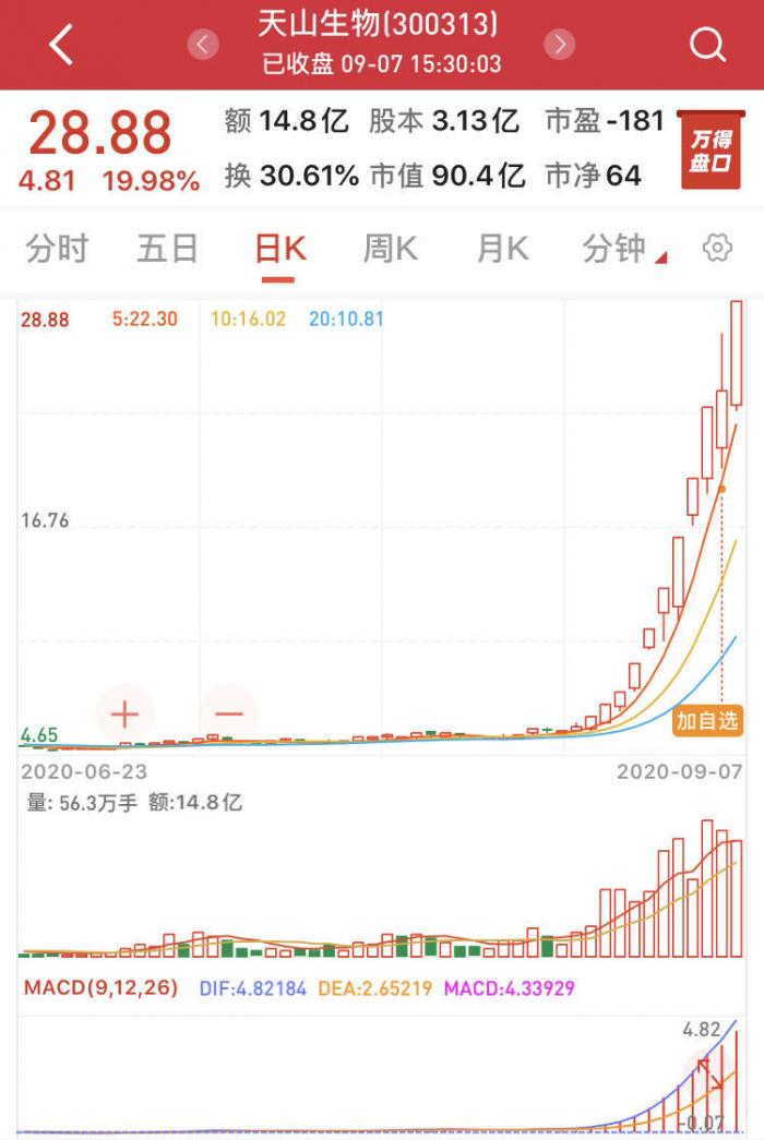 天山生物第8个交易日涨停,短短11个交易日,股价由5.83元/股涨至28.88元/股,暴涨近400%。