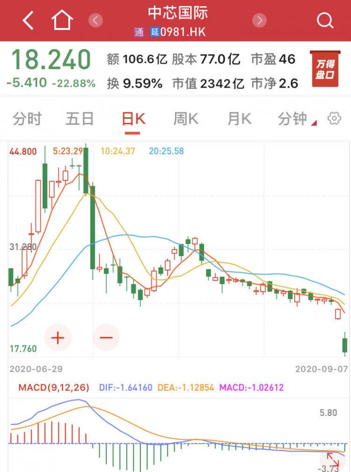 受美国政府可能将中芯国际列入贸易黑名单消息影响,9月7日,中芯国际重挫,A股跌11.29%,7月16日上市当天最高95元/元,现在是59元/元,正好反过来,跌去38%。