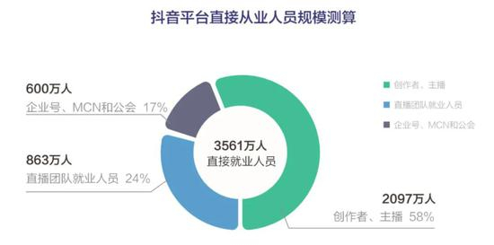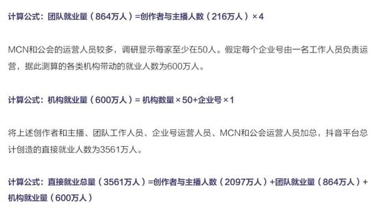 根据调研结果,抖音平台平均一个主播至少有4名辅助人员,而大中型和小微型机构的平均工作人员配置为50人,因此得出团队就业量864万人、机构就业量600万人、外加主播人数2097万人,合计直接就业数量3561万人的数字。