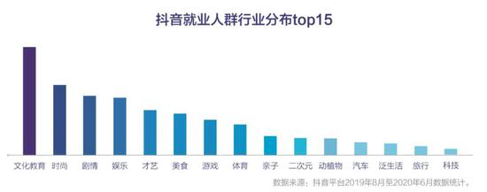 从抖音就业人群的行业分布来看,文化教育行业占比最高,远高于其他行业的从业者。其次是时尚行业,这同美妆、服装等电商热品的走红有关。