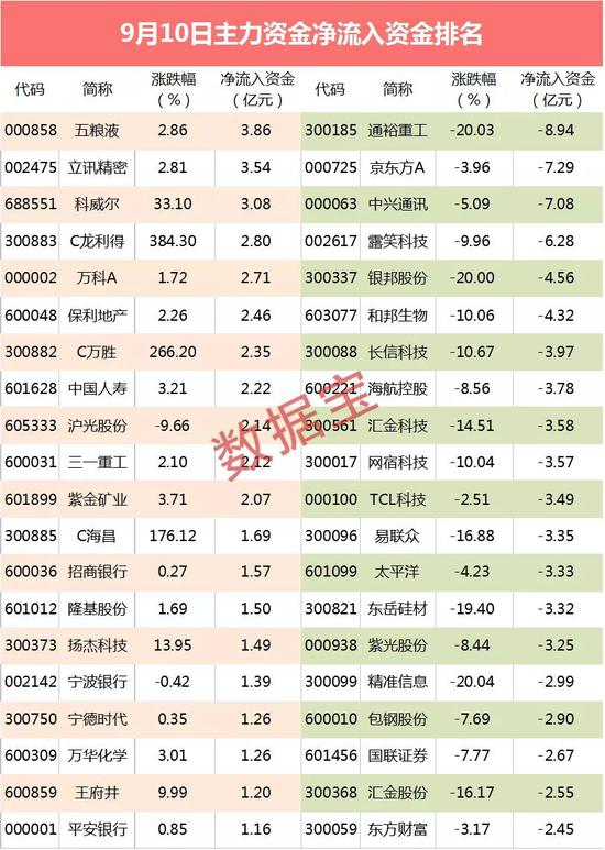 个股方面,尾盘仅沪光股份流入资金超亿元,金额为2.27亿元,公司为8月上市次新股,上市以来,公司股价过山车,从一字涨停到一字跌停,上市后15天累计换手率只有15%,多数中签股民还没来得及卖出,股价就被连续一字跌停堵死卖出通道。今日收盘集合竞价阶段,大量买单涌入打开跌停板,集合竞价成交金额超2亿元。格力电器、新和成、五粮液等3股尾盘流入资金超3000万元。