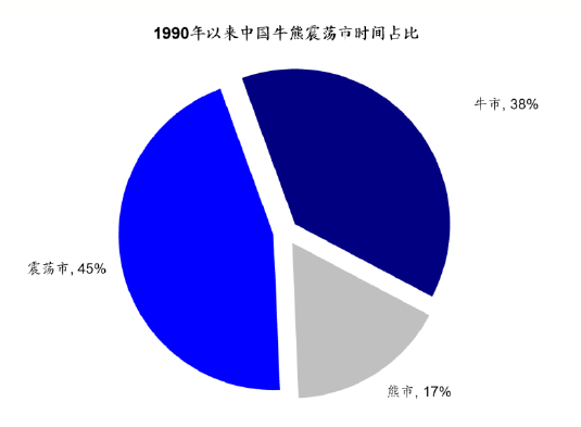 进一步看,A股历时最长的是震荡市,时间占比45%;牛市时间占比近40%;而熊市占比时间恰恰是最短的,只有17%。