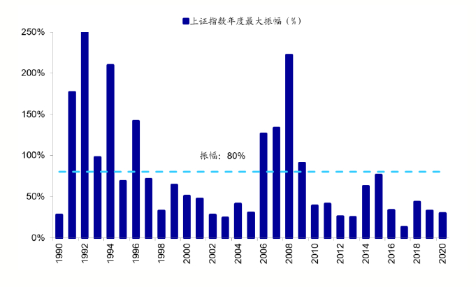 上证综指过去30年平均振幅为80%,最小13%;而道琼斯指数过去50年平均振幅仅为28%,最小为9%。