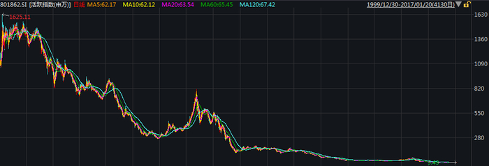 申万活跃指数是选取周换手率最高的100只股票作为成分股,每周调整一次。从1999年12月30日的1000点(指数基准日)至2017年1月20日的10.17点(指数停止更新),跌幅达99%。