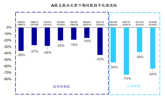 上证综指自发布以来,牛市平均年化涨幅为126%,熊市平均年化跌幅为58%,两者相距184个百分点;而道琼斯指数为20%、-29%,两者相距仅49个百分点。