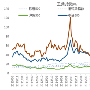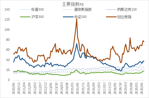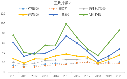 比较A股和美股的主要股票指数的PE值,A股中证500指数、创业板指都明显高于美股的三大指数,只有沪深300指数的PE值更低。