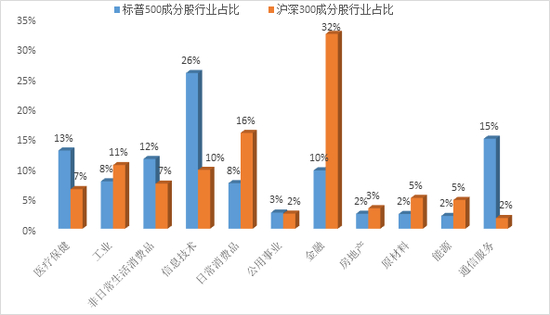 从上文对A股、美股估值指标的对比来看,A股估值似乎都高于美股。但由于两个市场行业构成差异很大,公司所处阶段也不同,指数的估值指标可能失真。比如,A股中市值占比最大的三个行业是:金融、日常消费品、工业;而美股中市值占比最高的三个行业是:信息技术、通信服务、医疗保健。明显的特征是,A股中金融、工业等传统行业占比很高,而美股中科技行业占比很高。