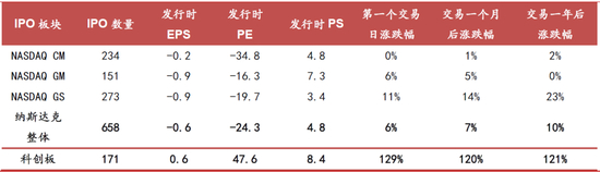 前面分析了A股与美股的科技板块的估值可比性较低,A股(尤其是科创板)中的成长初期的科技公司,与纳斯达克刚上市的公司则具有较高的可比性。因此,我们对科创板的上市公司与纳斯达克新上市的公司进行对比分析。