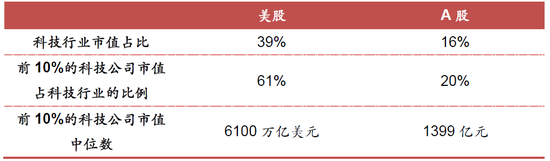 以GICS行业分类中的信息技术和通信服务作为科技板块,美股中科技行业的市值占比达39%,而A股只有16%,A股科技行业的市值提升空间还非常大,处于成长初期。从科技行业的集中度来看,美股科技行业中市值前10%的科技公司在行业中的市值占比高达61%,而A股近20%,可见A股科技行业的格局仍未成熟稳定。前10%的科技公司的市值中位数,美股是6100亿美元,而A股是1399亿元人民币,相距甚远。这些都表明,美股与A股的科技公司处于不同的发展阶段,估值指标没有可比性。