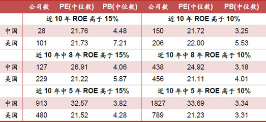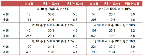 当时得到结论:A股中长期稳定、高ROE的公司(如ROE连续10年在10%或15%以上)PE、PB都比同档的美股低,而业绩差一些的公司中,A股估值仍高于美股。并提出“存量经济下龙头公司的确定性溢价有望继续提升”。