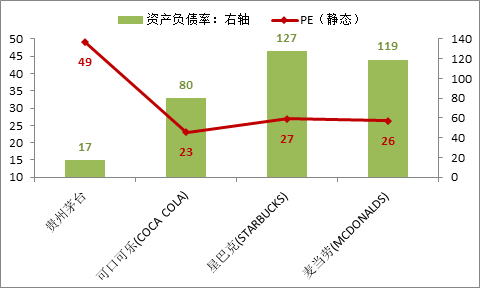 以A股中的消费龙头股贵州茅台与美股中消费龙头可口可乐、星巴克、麦当劳为例,进行比较分析。从静态PE看,贵州茅台接近50倍,明显高于可口可乐(23倍)、辛巴克(27倍)。但进一步分析,会发现美股消费龙头的资产负债率都远高于贵州茅台。星巴克和麦当劳的资产负债率甚至超过100%。